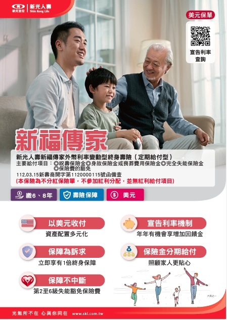 新光人壽新福傳家外幣利率變動型終身壽險(保障)(6、8、20年期)